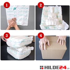 Die Instant Foam Bag Schaumverpackungen dehnen sich innerhalb von Sekunden zu maßgeschneiderten schützenden Schaumpolstern aus. Die Schaumpolster werden flach angeliefert und können daher effizient gelagert werden. Es muss kein weiteres Zubehör genutzt werden. Das Schaumpolster schmiegt sich an Ihre Produkte an und schützt so vor Schäden während des Transports.