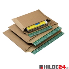 Damit Sie beim Versand maximal flexibel sind, kann die Karton-Versandtasche bis zu einer Höhe von 3,5 cm befüllt werden, wobei sich bei zunehmender Füllhöhe die Innen- und Außenmaße verringern. Für einen minimalen Aufwand und Packmaterialeinsatz sind die Bücher-Versandtaschen mit einem umweltfreundlichen Selbstklebeverschluss ausgestattet. Zur Vermeidung von Schnittverletzungen verfügen sie außerdem über einen Sicherheitswellenschnitt.