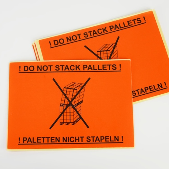 Die selbstklebenden Haftetiketten mit dem zweisprachigen Schriftzug "!PALETTEN NICHT STAPELN! / !DO NOT STACK PALLETS!" sind der perfekte Warnhinweis in Form und Farbe. Die Etiketten aus Papier weisen eine ausgezeichnete Klebkraft auf Karton und Folie auf. So verhindern sie, dass es beim Transport zu Schäden durch eine falsche Lagerung kommt. Die selbstklebenden Warnetiketten haften permanent. Die Anwendung ist einfach und schnell.