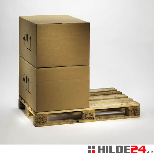 Die Außenmaße der Wellpapp-Containers sind auf das Maß von der Europalette (800 x 1200 mm) abgestimmt und sind bereits vorgedruckt mit den Symbolen Pfeile, Glas und Regenschirm. Zusätzlich sind die Palettenkartons mit 1 Zusatzrillung bei 300 mm ausgestattet.